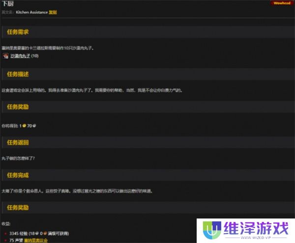 接着前往希利苏斯,找到塞纳里奥要塞的NPC——卡兰德拉斯,接取并完成任务【下厨任务】,然后就可以获得任务奖励【沙漠肉丸子配方】了。