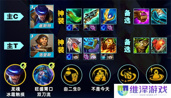 主C崔斯特:技能拥有混合伤害+控制,蓝牌回血、红牌AOE、黄牌单体点控,需要高攻速快速释放技能,成为全场输出核心。