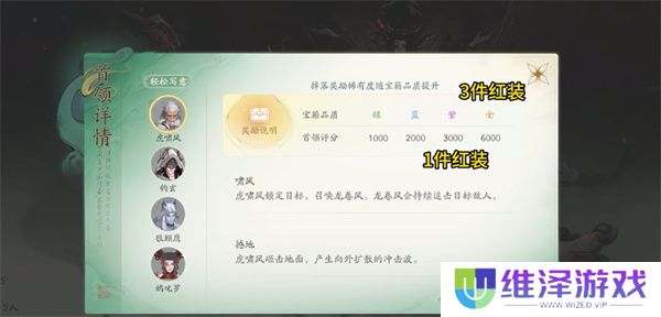 获取数量与挑战BOSS积分相关,3000分以下和6000分以下的紫色宝箱各只能获得一件,而6000分以上的金色宝箱则可获得三件,并有机会获得金色宠物和装备精炼石。提升护符等级,确保生存。