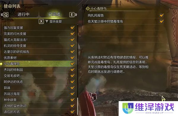 任务名字:小心毒怪鸟(在天堑沙原狩猎毒怪鸟即可完成任务)