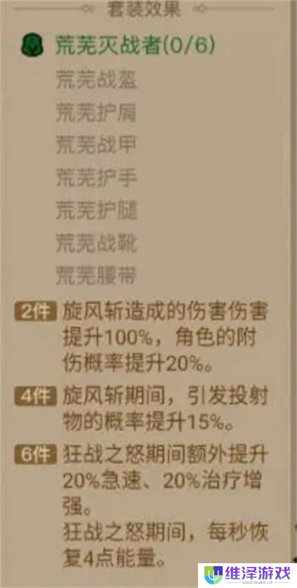六件套:狂战之怒终极技能强化,短时间内可多次释放旋风斩,增强输出和续航