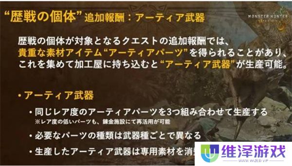 讨伐历战怪物可获得特殊报酬,用于在工房制造Atia零件。