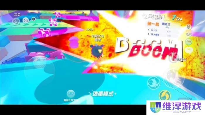 在我们通关后,还可以进入“魂蛋”模式,该模式下不可以捡道具,但是可以碰撞其它选手,或举起别人进行干扰,还可以触碰炸弹和地雷。大家可以随心所欲,帮助他人通关或是将其扔出场地,甚至带着他一起撞地雷炸弹,这都是你说了算~