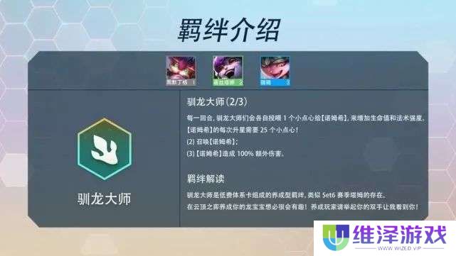 如果你的队伍中没有龙,龙鳞冠军会造成额外的魔法伤害,并减少30%来自生命值超过2500的敌人的伤害。【(2)30%魔法伤害;(4)60%魔法伤害;(6)100%魔法伤害】。