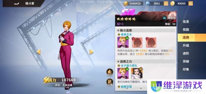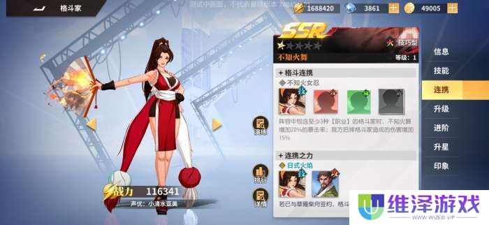 另外,前期火舞和坂崎百合也可替换为麦卓和薇丝,就是拳皇98里和八神一组的那两个性感御姐。这两个都是sr卡易获得,且自身技能机制还不错,全队连携也都能激活。